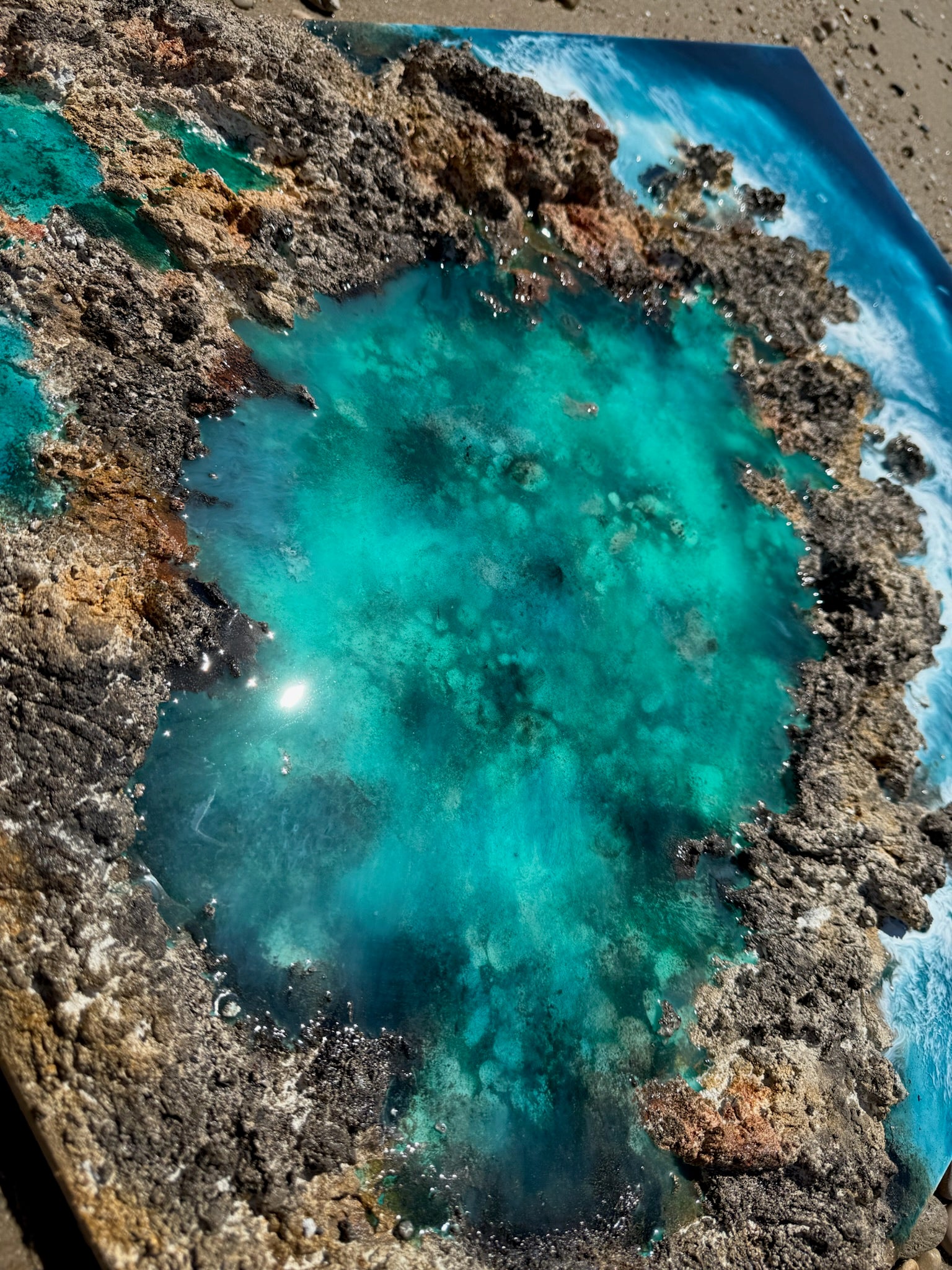 En esta ocasión usaremos diferentes técnicas pictóricas y escultóricas para conseguir el efecto de piscina con efecto 3D de rocas sumergidas bajo el agua mediante una técnica única creada por Eva, crearemos un paisaje realista, con poderosas olas de océano rompiendo en las rocas.